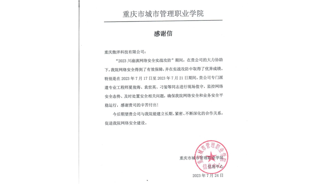 2023川渝滇网络安全实战攻防活动7月17日在重庆市璧山区启动。来自四川、重庆、云南三省市的13支代表队对三地170套重要系统进行非破坏性实战渗透,以此检验、提升关键信息基础设施和重要数据安全防护能力和水平。傲洋团队在AI护网平台支撑下为重庆市城市管理职业学院提供了高水平的护网服务并取得满分好成绩。